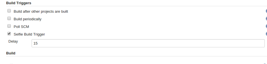Selfie is a Jenkins build trigger plugin which lets a project to trigger itself after a configured delay. The plugin appears as one of the build triggers while configuring a new project.